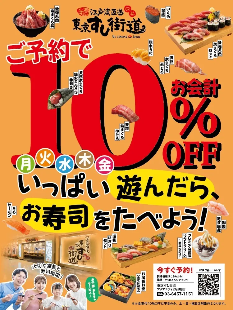 アクアシティお台場に位置する「江戸湾直送 回転 東京すし街道」では、2026年2月13日から新たに平日限定の予約キャンペーンを開始します。このキャンペーンでは、月曜日から金曜日までの平日に予約をして来店すると、なんとお会計が10%オフ。外食を楽しむうえで、最も気になるのは待ち時間ですが、このサービスを利用すれば、快適な食事時間を確保することができます。