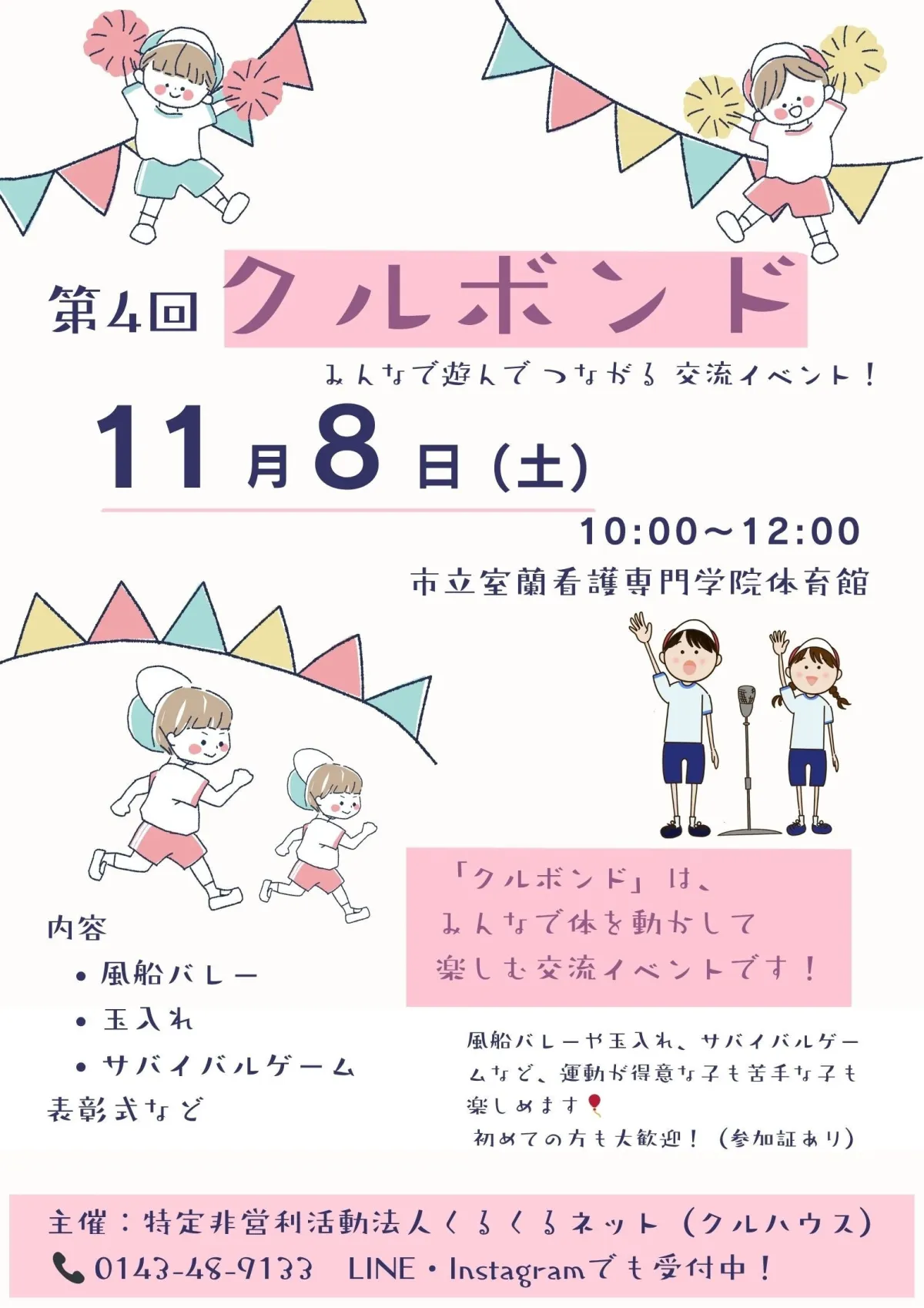2025年11月8日(土)、室蘭市にて心温まる地域交流イベント「第4回クルボンド」が開催されます。場所は市立室蘭看護専門学院の体育館で、子どもから大人まで楽しめるプログラムが盛りだくさんです。エントリーは不要で、参加費は無料。地域の皆さんが気軽に参加できるこの機会、見逃せません!