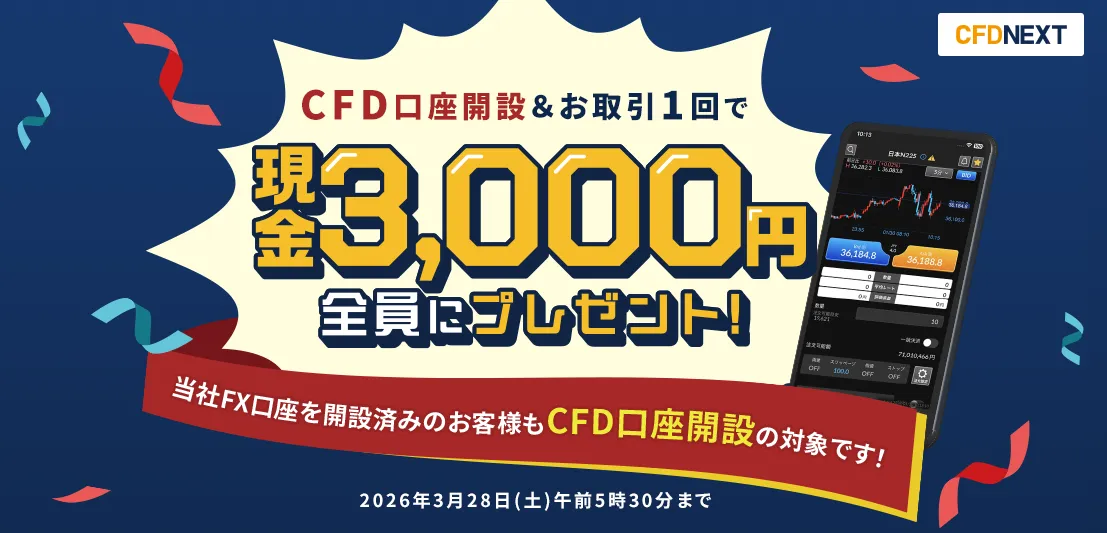 株式会社外為どっとコムが、2026年3月2日から「CFD口座開設&お取引1回でもれなく現金3,000円をプレゼント!キャンペーン」を開始します。これは、新たに『CFDネクスト』の口座を開設し、取引を1回行えば現金3,000円が受け取れるという非常に魅力的なチャンスです。