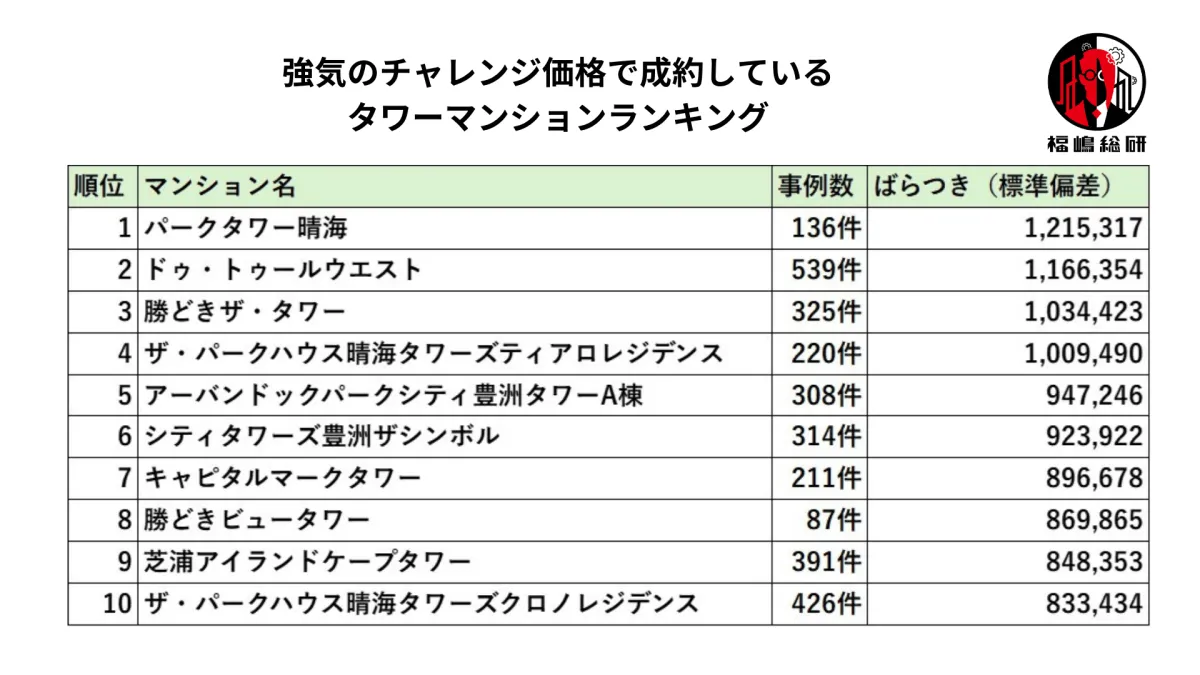 強気のチャレンジ価格で成約を果たしている湾岸タワーマンションをランキング形式で紹介します。なお、ここでは標準偏差が大きいほど、その物件がどれだけ価格において強気であるかが示されています。詳細は以下の表で確認できます。