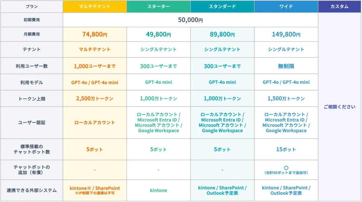 この「マルチテナントプラン」では、1つのシステム環境を共有し、多くの利用者が一緒にAIを利用することができます。これにより、月額74,800円というリーズナブルな価格で最大1,000ユーザーまで利用可能で、トークン上限は2,500万トークンとなっています。このフレキシブルなプラン設計により、企業は自身の規模や目的に応じて利用方法を選択できます。