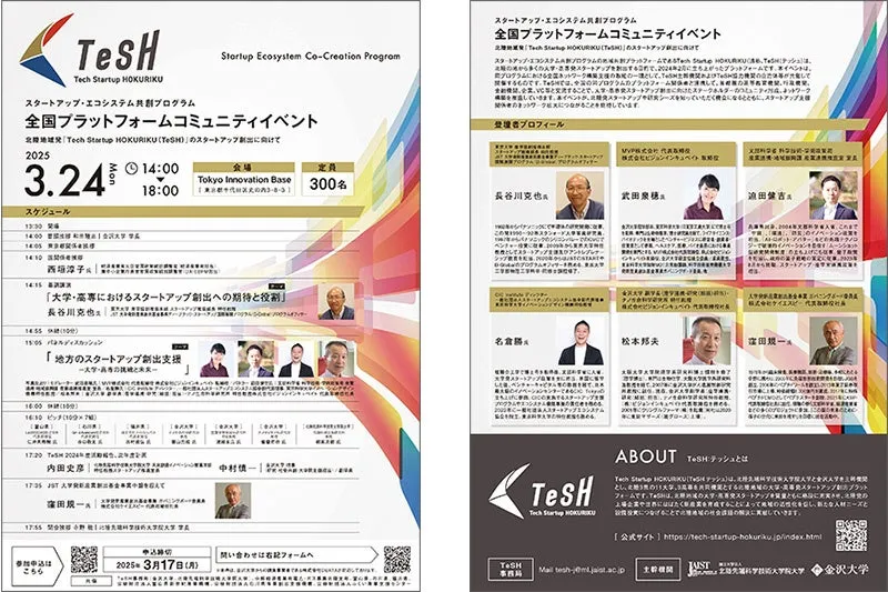 本イベントは、金沢大学と北陸先端科学技術大学院大学が主催。北陸地方の大学や高専と首都圏の事業化推進機関、全国プラットフォームとのコミュニティ形成を図ることを目的とし、事業会社や産業支援機関とのネットワーク構築も視野に入れています。参加者が更なる連携を深めるための貴重な機会となることでしょう。