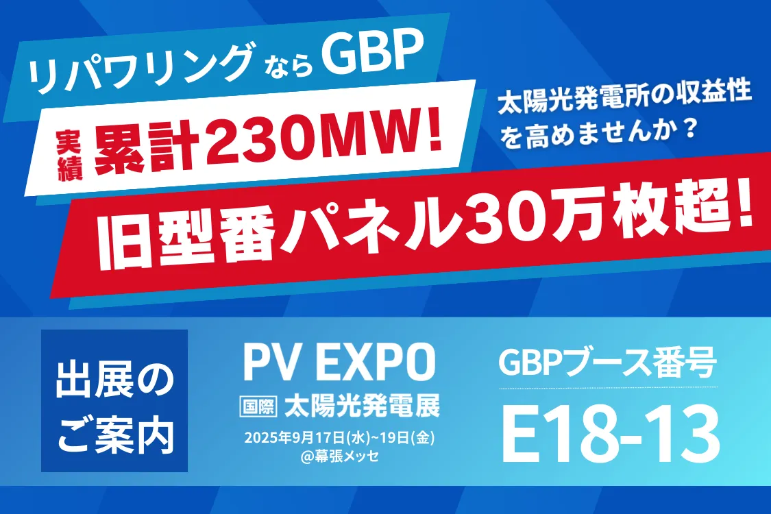 2025年9月17日から19日まで、幕張メッセにて開催されるPV EXPO【秋】~第21回 [国際] 太陽光発電展に、GBP株式会社が出展します。再生可能エネルギーやEV自動車部品、AI・IoT領域における先進技術を駆使し、急速に成長しているGBPは、特に「リパワリング」をテーマにしたワンストップソリューションを紹介します。