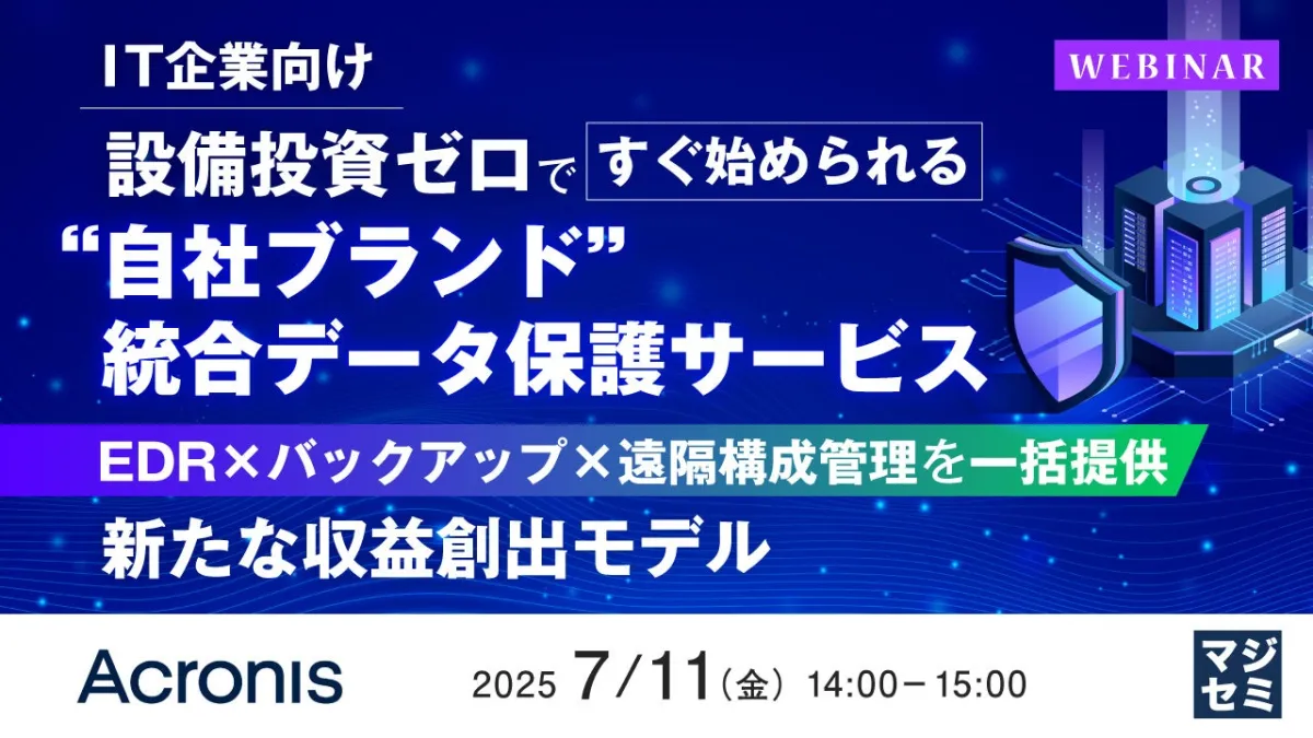 このような背景を受け、アクロニス・ジャパン株式会社が主催するウェビナーでは、自社ブランドで実現する統合データ保護サービスについて詳しく説明します。ウェビナーでは、顧客の情報資産を体系的に保護する仕組み、具体的なマネージドサービスの展開方法についてお話しします。特に、Acronis Cyber Protect Cloudのプラットフォームを活用した“EDR×バックアップ×遠隔管理”の統合運用管理の方法について、実際の構築ステップや料金設計、販促ツールまで具体例を交えて紹介します。