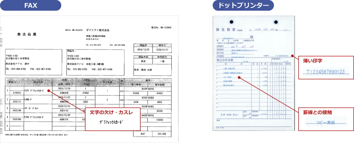 ドットプリンターで印字された書類やFAXで届く情報は、手入力のミスや時間のロスを引き起こし、これが結果としてコスト増大や業務品質の低下につながっています。こうした課題を解決すべく、PFUは「DynaEye 11」の機能を強化し、特にドットプリンターやFAXの活字をデジタル変換する際の精度を高めました。