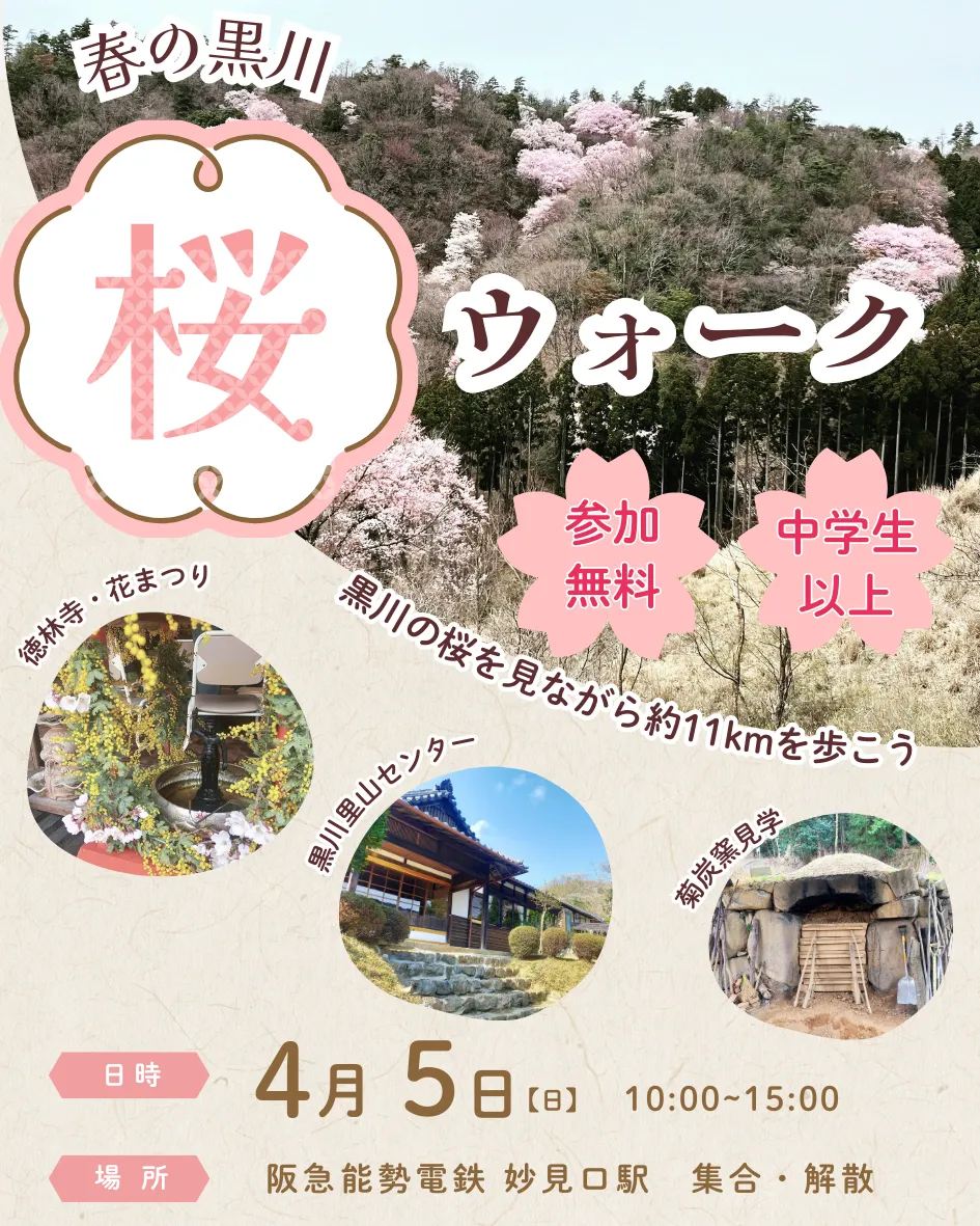 春の訪れを感じる4月の初め、兵庫県川西市の黒川において、特別なウォーキングイベントが開催されます。その名も「春の黒川 桜ウォーク」。大阪から電車でたったの1時間ほどでアクセス可能なこの里山は、自然と歴史を感じる素敵なスポットです。