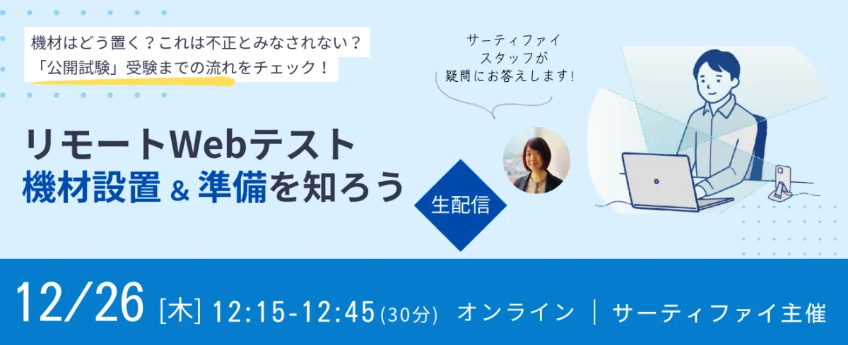 株式会社サーティファイが、2024年12月26日にリモートWebテストの機材設置・準備を生配信します。この配信は、在宅や勤務先での試験受験が可能な「リモートWebテスト」を利用する方々に向けたもので、機材の設置に関する不安や疑問を解消することを目的としています。