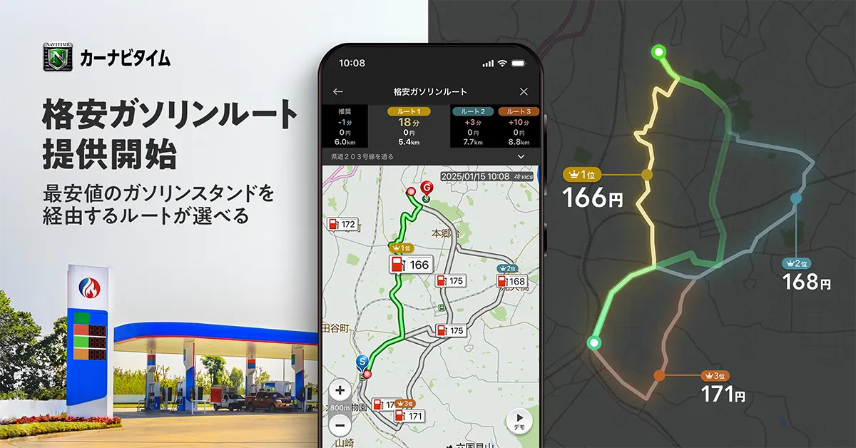 株式会社ナビタイムジャパンが2025年1月16日(木)から、人気のカーナビアプリ『カーナビタイム』に新しい機能を追加します。この機能は、ユーザーが出発地点から目的地までの道中にある最も安いガソリンスタンドを考慮し、経由地として組み込んだルートを提案する「格安ガソリンルート」検索機能です。これにより、ガソリン価格が高騰する中でも、より経済的なドライブが可能になります。