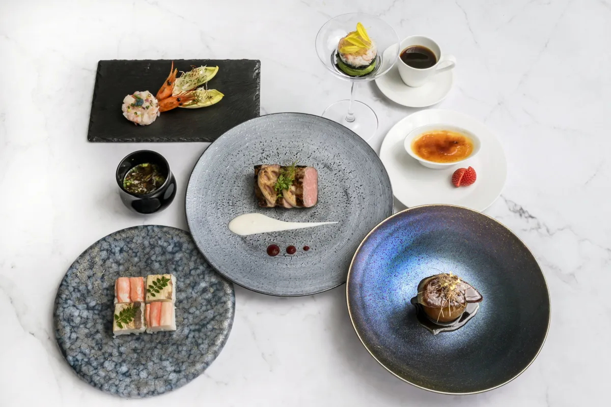 宿泊プランには、特製ディナーコース「金沢フュージョン」が含まれており、古き良き和食にイタリアンやフレンチの要素を融合させた独特なメニューが用意されています。このコースは、ホテル金沢の副総料理長や和食料理長が手がけたもので、冬の味覚である「甘えび」「かに」「ぶり」「のどぐろ」といった厳選素材を最大限に活かした料理が魅力です。