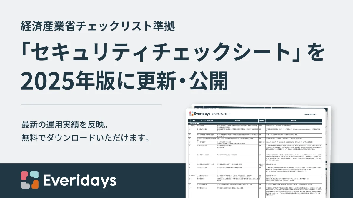 近年、クラウドサービスを導入したいと考える企業や組織からは、情報セキュリティ対応状況を事前に確認したいというニーズが高まっています。特に、官公庁や大手企業では、クラウドプロバイダーのセキュリティ対策を評価する際に第三者の基準が重視されるケースが増えています。Everidaysでは、2023年1月から既に経済産業省のチェックリストに基づいたセキュリティチェックシートを提供しており、今回の更新で2025年の運用実績を反映し、各項目の内容を最新情報に改訂しました。