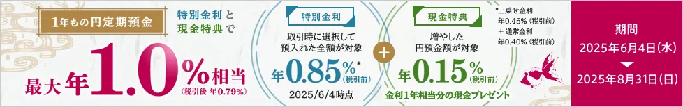 - 1年もの円定期預金の場合、通常金利年0.40%(税引後年0.31%)に年0.45%(税引後年0.35%)を上乗せし、特別金利年0.85%(税引後年0.67%)が適用されます。これにより、2025年8月31日までの期間中の預け入れに対して通常よりも高い金利を享受できます。