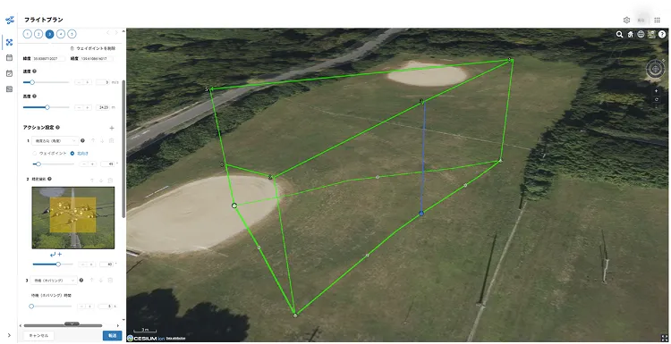 これまでは、飛行ルートの編集が手元のプロポの画面で行われていましたが、連携強化後は『SENSYN CORE Pilot』の大画面PC上で詳細に編集できるようになりました。この機能によって、緯度経度、高度、画角を維持したまま、撮影アクションを追加・編集することも可能です。