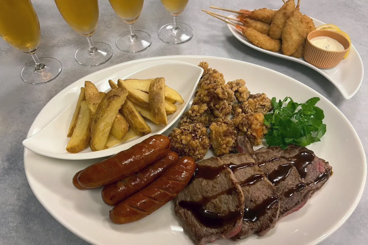 提供される料理も、その場の雰囲気にぴったりで、牛ロースステーキ、フライドチキン、白身魚と海老の串カツ、チョリソー付きフライドポテト、枝豆など、どれもお酒との相性を考えたメニューです。大皿スタイルで提供されるので、シェアしながら楽しむことができ、まさに夏のパーティにふさわしい内容となっています。