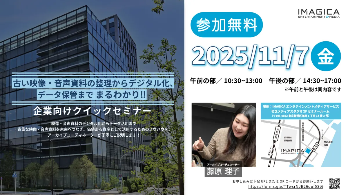 株式会社IMAGICAエンタテインメントメディアサービスが、2025年に向けた重要なセミナーを開催します。テーマは「古い映像・音声資料の整理やデジタル化、データ保管」。このセミナーでは、企業や教育機関、行政機関の方々に向けて、貴重な資料を未来へつなぎ、価値ある資産として活用するための具体的な方法を提供します。