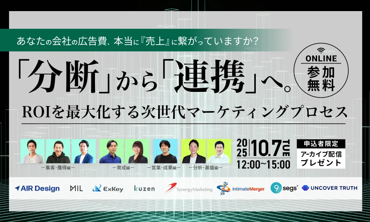 2025年10月7日(火)に、無料のオンラインカンファレンス「あなたの会社の広告費、本当に『売上』に繋がっていますか?」が開催されます。このセミナーは、広告費が売上に直結しているかという疑問を解消すべく、さまざまな企業が集結し、最新のマーケティング手法について解説するものです。