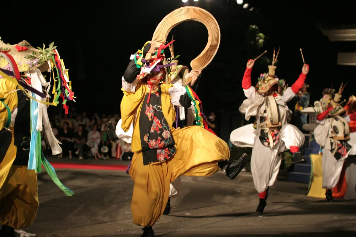 「山代大田楽」は中世芸能の「田楽」を現代に再現した創作舞台です。色とりどりの衣装を着た演者たちが、伝統的な笛や太鼓の音に乗せて舞い踊ります。このイベントは毎年夏に行われ、地元住民や観光客に愛されてきました。古き良き伝統と現代の感覚が交差する様子は、観客を幻想的な世界へと誘います。