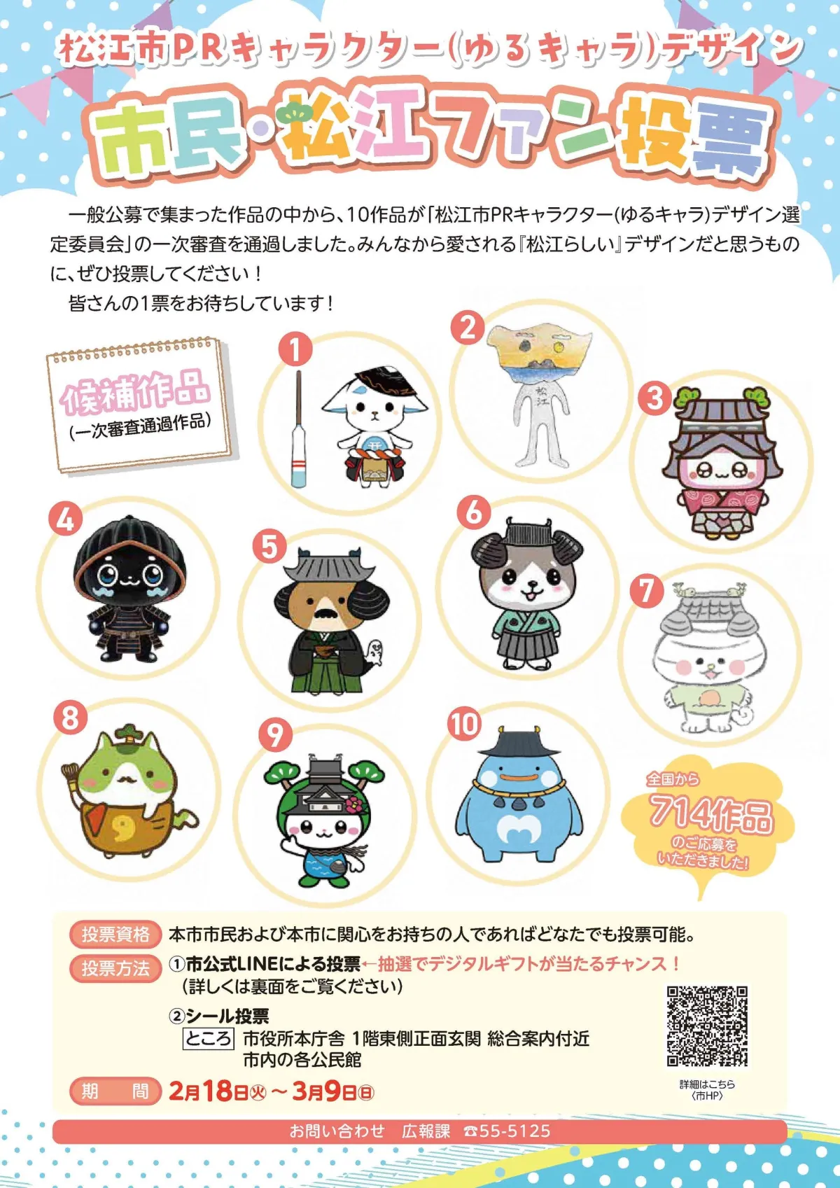 投票期間は、令和7年2月18日(火)から3月9日(日)まで。この機会に、ぜひとも松江の魅力を代表するキャラクターに自分の声を届けてください。