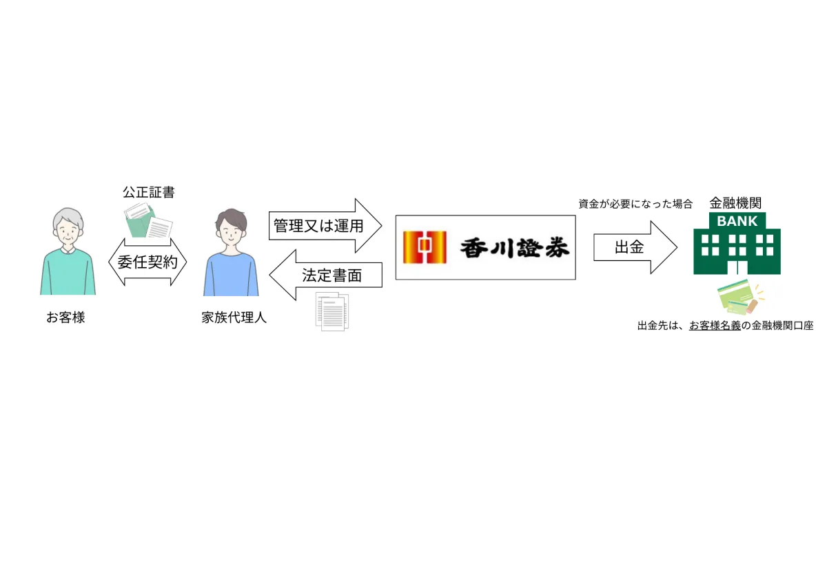 お客様と家族代理人が契約を結んだ後も、お客様は引き続きお取引を続けることが可能ですが、もし本人との取引が難しくなった場合には、家族代理人がその役割を引き継ぎ、資産の適切な管理や運用を行います。