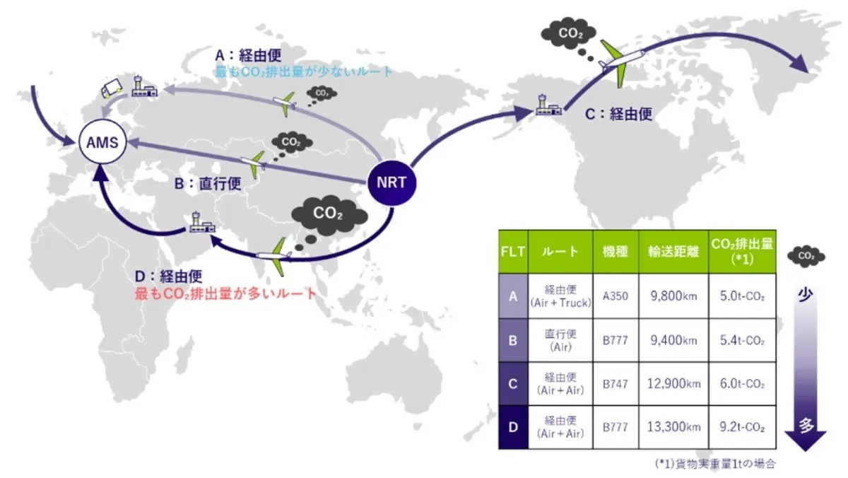 「NX-GREEN FORWARDING ~AIR~」では、選択するフライトのCO2排出量を可視化するツール「NX-GREEN Calculator」を使用しています。このツールは、国際的なGLECフレームワークに基づいたバイアスのない排出量データを提供します。これにより顧客は、提案された複数のフライト候補から自社のCO2削減目標に沿った最適なプランを選ぶことが可能です。対象となる路線には成田発のアムステルダム、フランクフルト、パリ行きの便があり、提案されたプランの中にはCO2排出量が異なる三種類の選択肢があって、顧客は自分のニーズに合ったものを選ぶことができます。さらに、経由便や機材の合理的な組み合わせによって、月間で最大約40%のCO2排出量を削減できる見込みです。
