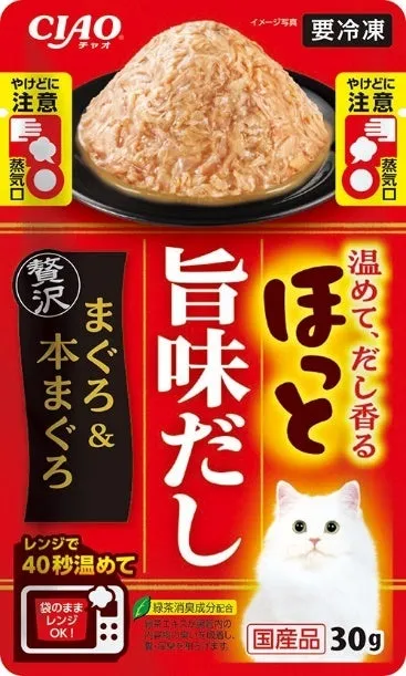 「CIAOほっと旨味だし」は、猫ちゃんが楽しむために選ばれた贅沢な素材が特徴です。本まぐろとほたて貝柱をふんだんに使用した2つのフレーバーがあり、素材本来の旨味を引き立てる「だし」が用いられています。袋のまま電子レンジで温めることができ、美味しいだしの香りが広がる新しいスタイルの冷凍ペットフードです。