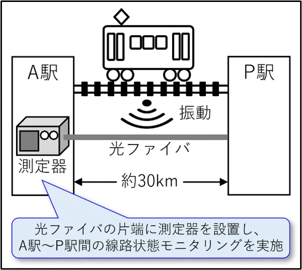 この技術の特徴は、光ファイバに光を照射し、その反射光の変化を解析することで、特定の地点での変化を捉えることができる点です。単一のセンシング装置で数十キロにわたる線路上の振動をリアルタイムで把握できるため、広範囲にわたる状態を高精度でモニタリングすることが可能になります。さらに、物理的な接触が不要であり、保守要員が設備に直接触れることなく異常を検知できるため、安全性の向上にも寄与します。