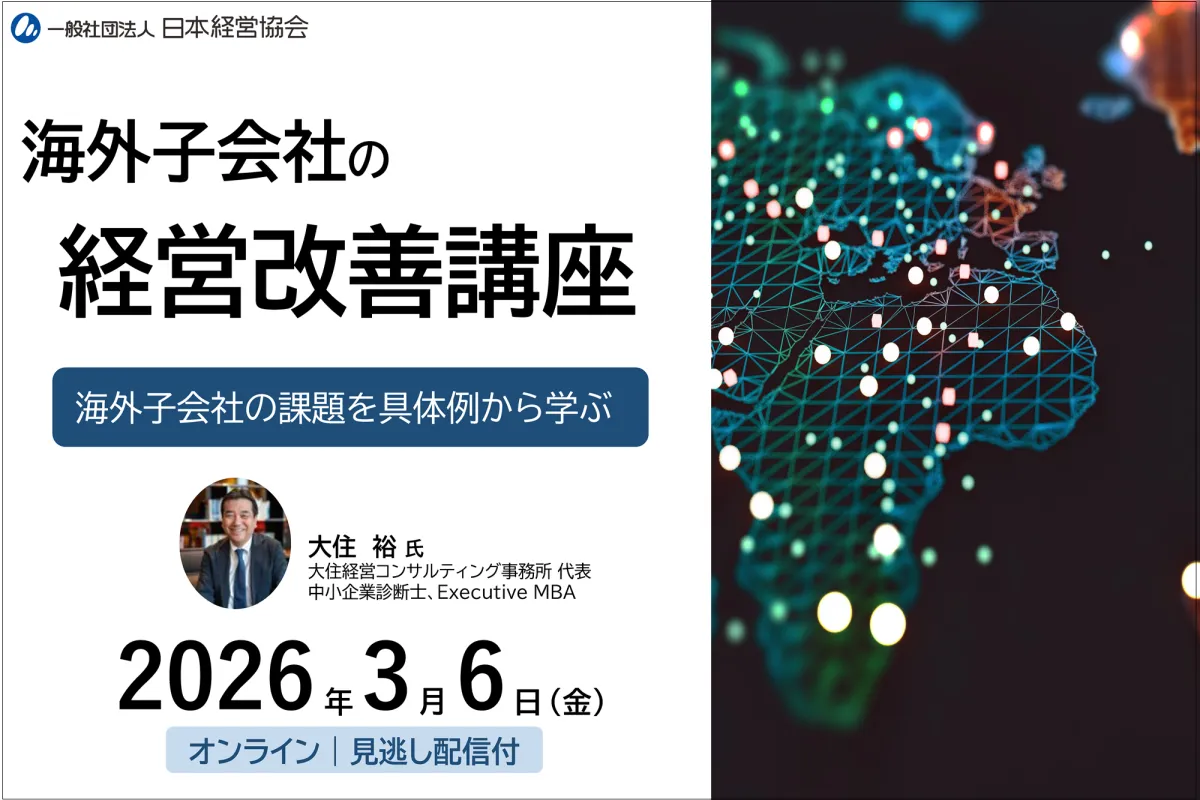 日本経営協会(NOMA)は、2026年3月6日(金)に「海外子会社の経営改善講座」をオンラインで開催します。この講座は、海外事業における現場の課題を具体例を通じて学び、実務に役立つ改善の視点を習得することを目的としています。参加者は、日本国内どこからでも受講可能で、見逃し配信もありますので、自分のペースで学ぶことができます。