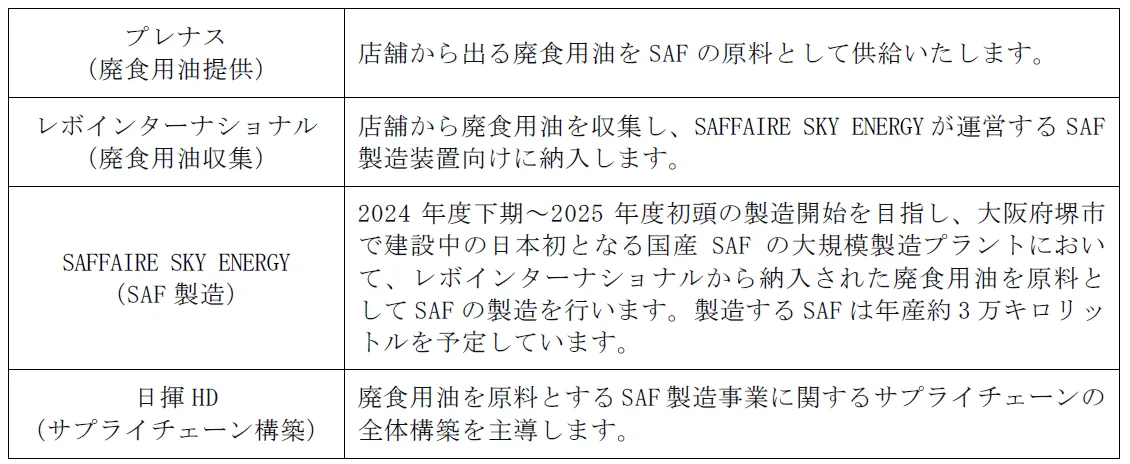 プレナスは、日揮ホールディングス、レボインターナショナル、そして合同会社SAFFAIRE SKY ENERGYとパートナーシップを結び、国内SAFの供給に貢献すべく協力を進めています。これにより、国産の廃食用油を利用した年産約3万キロリットルのSAFを製造するプラントの建設計画も進行中です。