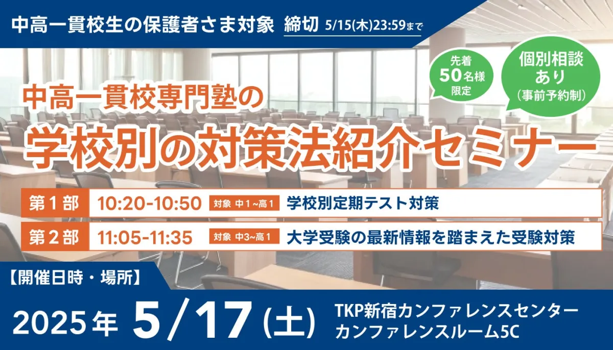 2025年5月17日、新宿で中高一貫校に通う生徒と保護者を対象にした無料セミナーが開催されます。このイベントは、中高一貫校専門の個別指導塾『WAYS』が主催しており、さまざまな学校に特化した対策法を学ぶ機会となります。