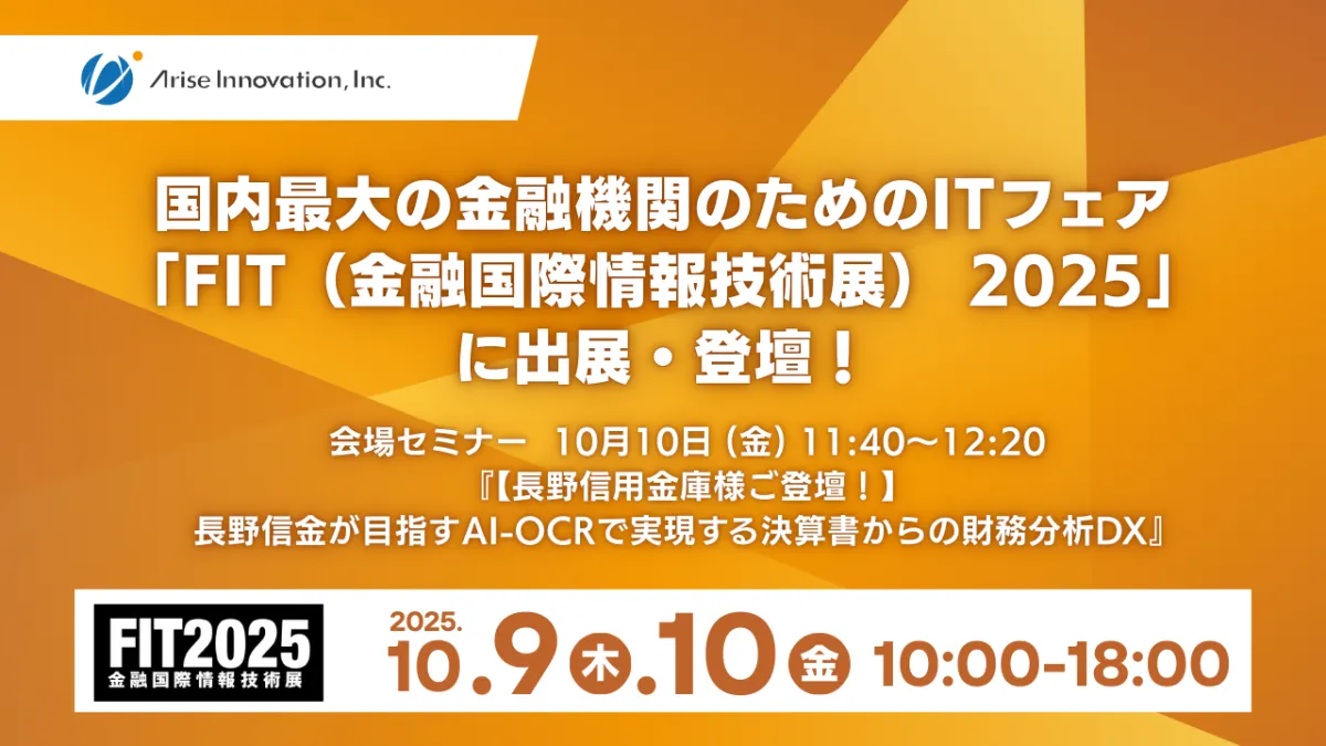 アライズイノベーション株式会社(東京都中央区)は、2025年10月9日と10日に東京国際フォーラムで開催される「FIT(金融国際情報技術展)2025」に出展します。この展示会では、同社の「AIRead決算書データ化分析ソリューション」を紹介し、金融業界における業務効率化の実現を目指します。