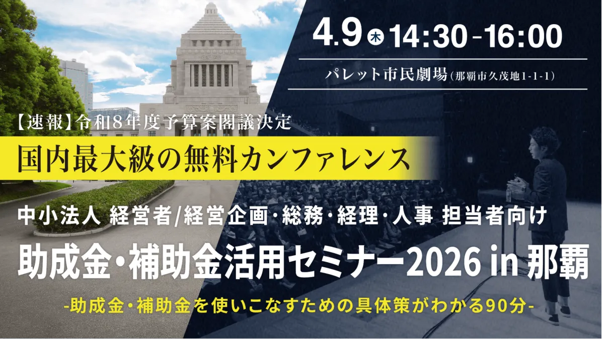 今回、一般社団法人日本中小企業経営者協会が主催する「助成金・補助金活用セミナー2026 in 那覇」が4月9日(木)に開催されます。このセミナーでは、中小法人が知っておくべき助成金や補助金に関する情報が提供され、自社に合った制度を見つける方法や申請のコツが詳しく解説されます。