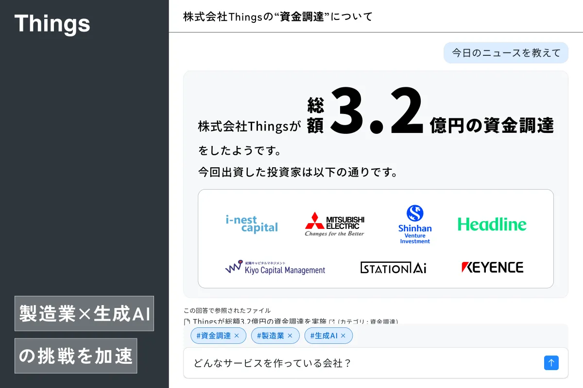 株式会社Things(本社:東京都港区、CEO:鈴木敦也)は、第三者割当増資を通じて約3.2億円の資金調達を実施したことを発表しました。この資金調達により、同社は製品開発や採用・組織体制の強化を図り、製造業における技術情報の可視化と共有を促進する意向です。これにより、業界全体の品質向上と技能継承を支援することを目指しています。