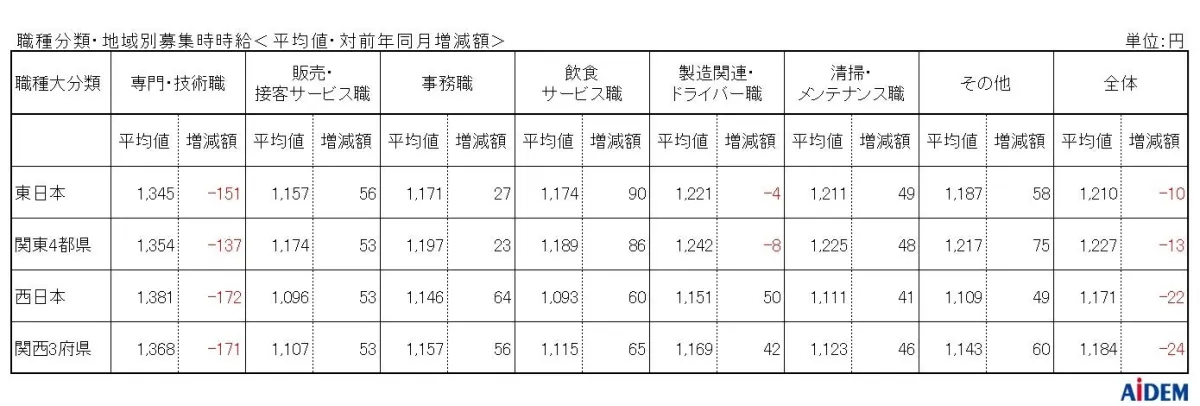 2024年9月、パート・アルバイトの募集に関する平均時給が株式会社アイデムによって報告されました。調査によると、東日本と西日本で平均時給に違いが見られます。具体的には、東日本エリアの平均時給が1,210円、西日本エリアは1,171円と発表されています。特に、大阪府の事務職の平均時給は1,189円を記録し、過去最高値を更新しました。