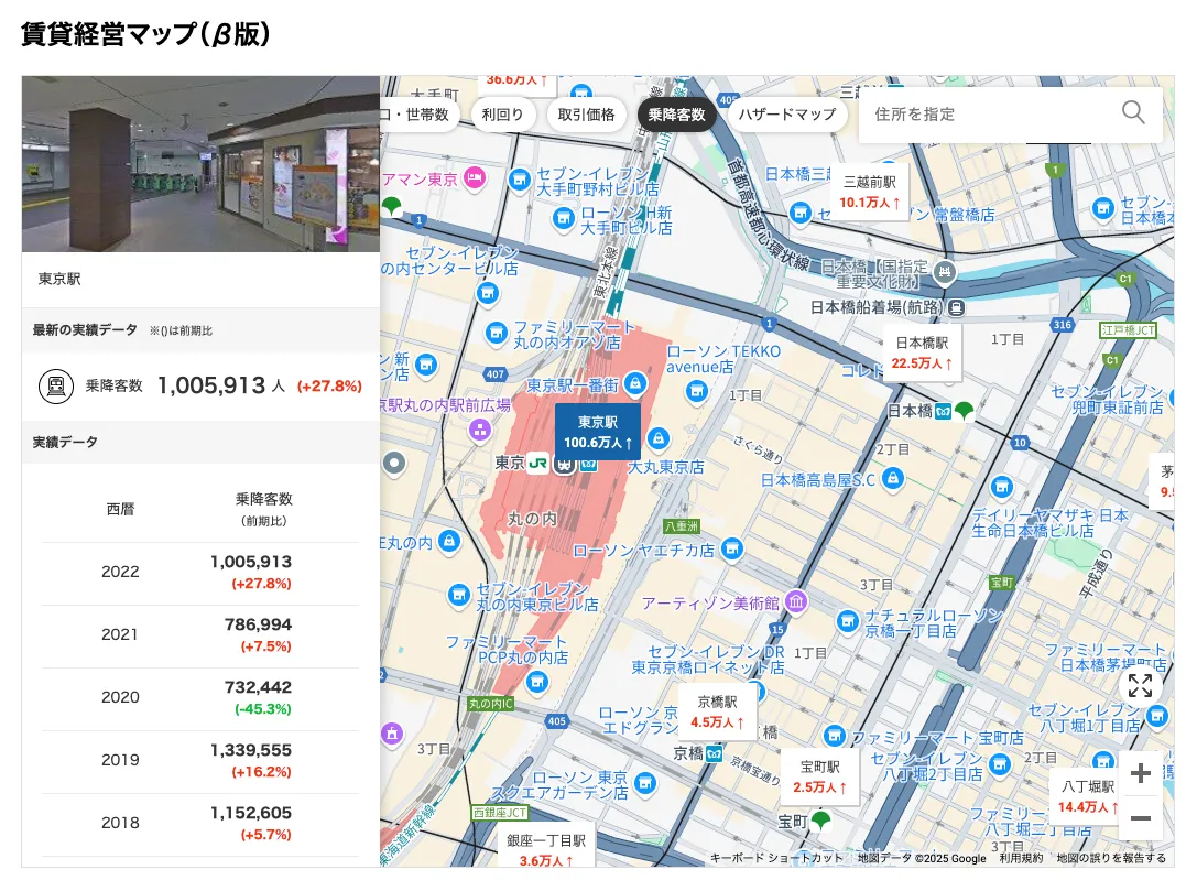 これまでも「賃貸経営マップ」は、物件購入やエリア分析に際して必要な情報を一つの地図上で確認できる便利なツールとして多くの支持を集めていました。しかし、多くの不動産投資家にとって、最寄り駅の乗降客数は賃貸需要を見込む上での重要な指標でした。今回の新機能追加によって、その乗降客数の推移をタップ一つで確認できるようになりました。
