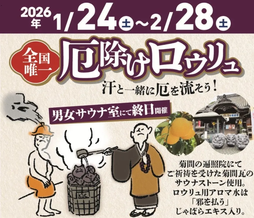2026年1月24日から2月28日の期間、愛媛県・松山市にある「伊予の湯治場 喜助の湯」と「しまなみ温泉 喜助の湯」で、毎年恒例の『厄除けロウリュ』が開催されます。昨年は61,000人もの来場者があったこのイベントは、節分シーズンに大きな人気を誇ります。