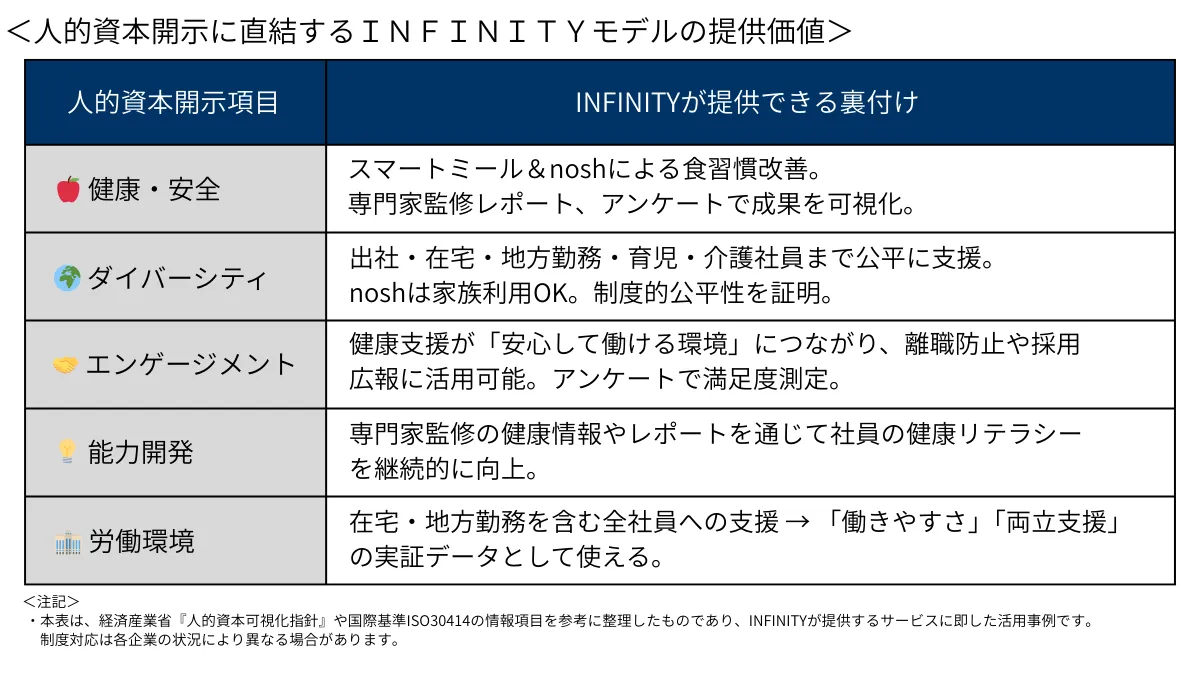 2025年以降、多くの企業には健康経営優良法人2026の認定や食育実践優良法人顕彰、さらには人的資本情報の開示が求められます。INFINITYのモデルは、これらの要件を同時に満たすことができるため、企業の人事や経営企画において大きな注目を集めています。特に、出社社員だけでなく在宅勤務や育児・介護の世代までを考慮した公平な支援制度の整備は、ダイバーシティ推進においても高く評価されています。