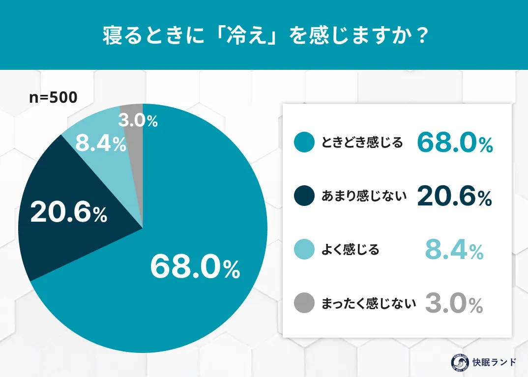 秋の訪れと共に、急激に気温が下がり始めると、多くの人が感じるのが「手足の冷え」や「寝つきの悪さ」です。特に女性はこの時期に冷えに悩むことが多く、その影響が睡眠に及ぶことも珍しくありません。この課題に光を当てるため、快眠グッズを紹介する「快眠ランド」を運営するムーンムーン株式会社が、全国の20〜60代男女500名を対象に「冷え」と「睡眠」に関する実態調査を実施しました。