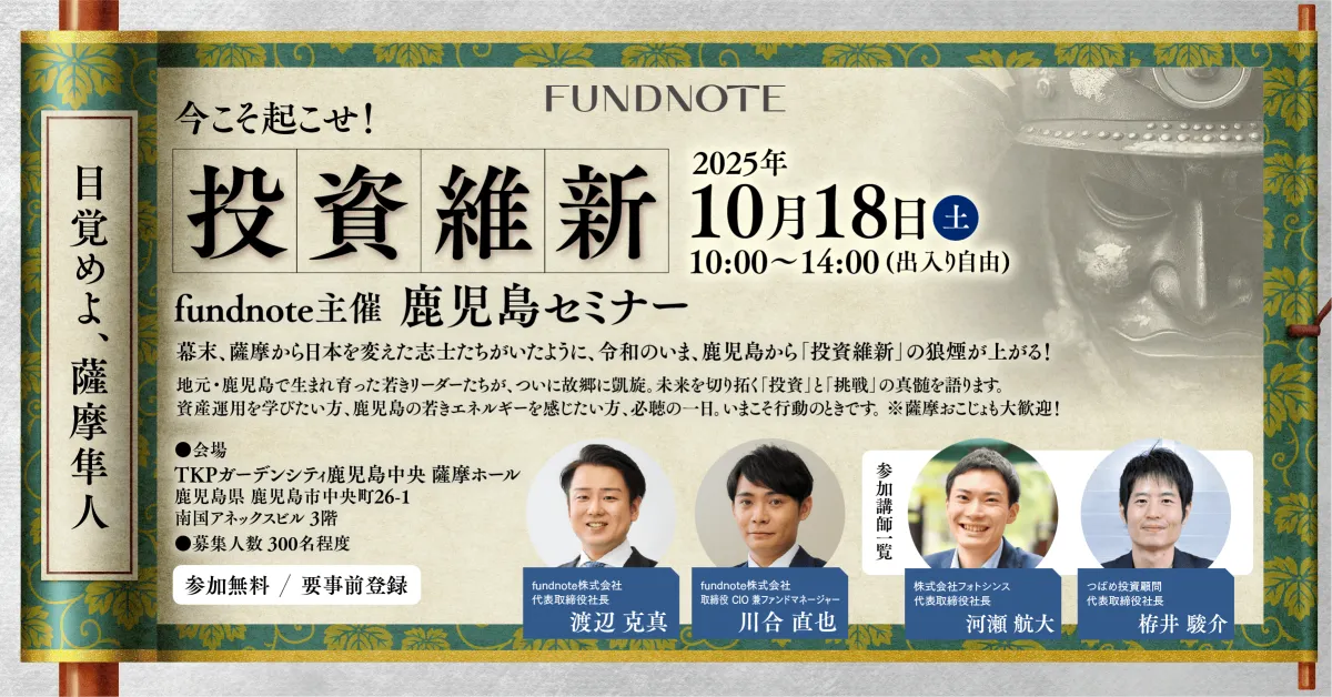 2025年10月18日(土)、鹿児島市中央町で特別な投資イベント「目覚めよ、薩摩隼人 今こそ起こせ!投資維新」が開催されます。このイベントは、鹿児島の地元に根ざした若手経営者が集まり、未来の投資について考え、議論する場となります。