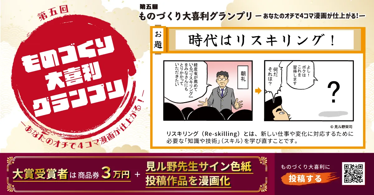 株式会社テクノアは、2025年7月1日から『第五回ものづくり大喜利グランプリ~あなたのオチで4コマ漫画が仕上がる!~』を開始します。このイベントは、リスキリングをテーマにした4コマ漫画のオチとなるセリフを募集するものです。学生からプロまで、幅広い層の方々が参加できるチャンスです!