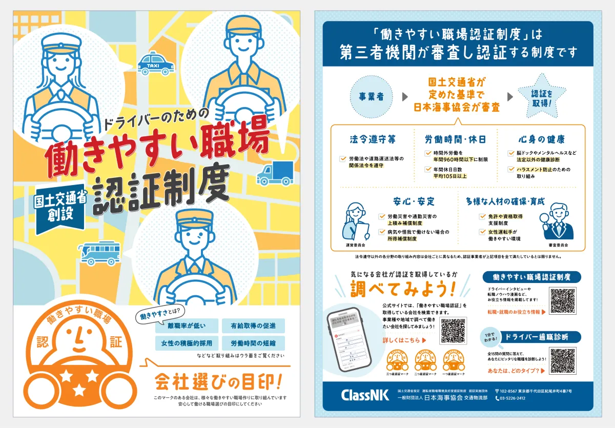 2025年4月、全国の求職者に向けて新たなリーフレットが完成しました。このリーフレットは、データドライバーが選ぶ際の重要な指標となる「働きやすい職場認証制度」の内容をわかりやすく伝えることを目的としています。全国のハローワークや教習所、業界団体に配布され、求職者が新たな職場を見つける手助けをします。