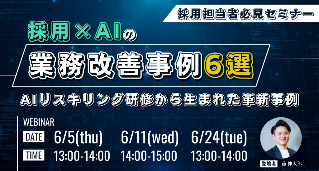 今回のセミナーでは「採用×AIの業務改善事例6選〜AIリスキリング研修から生まれた革新事例〜」をテーマに、中小企業がAIを活用して採用業務を最大82%効率化できる方法をご紹介します。時代は流れ、求人票の作成や候補者へのスカウトメール、面談報告が全て手作業では限界があります。これらの作業は多くの時間と手間を要し、結果的に機会損失につながります。このセミナーを通じて、手作業からの脱却方法と、業務の効率化を実現するための具体的なステップを学ぶことができます。