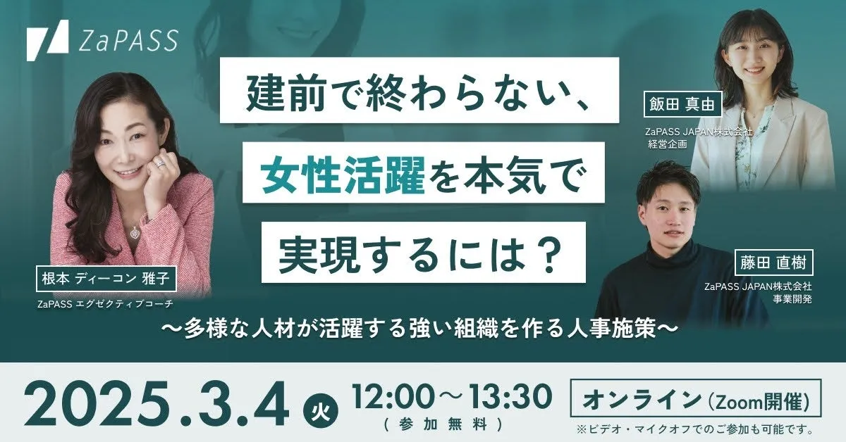 2025年の国際女性デーに向け、ZaPASS JAPAN株式会社(本社:東京都千代田区)は3月4日(火)12:00~13:30に、特別オンラインセミナー「建前で終わらない、女性活躍を本気で実現するには?」を開催します。このセミナーは、企業の人事担当者や経営層を対象に、女性管理職の活躍を促進するための実践的なアプローチを模索します。