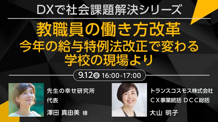 トランスコスモス株式会社が、2025年9月12日にオンラインで開催するセミナー「DXで社会課題解決シリーズ」の一環として、教職員に関する働き方改革を取り上げます。このセミナーでは、近年の給与特例法改正による学校現場での影響や、教職員が抱える課題について深く掘り下げていきます。
