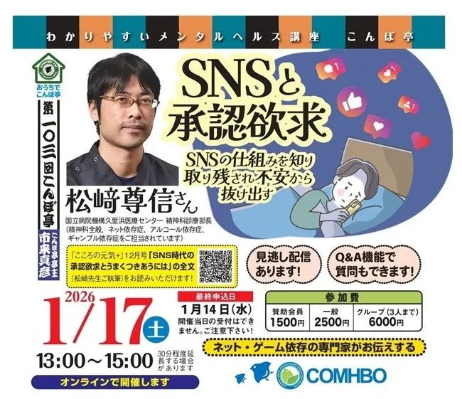特定非営利活動法人地域精神保健福祉機構、通称NPO法人コンボが主催する「こんぼ亭月例会」の第103回が、2026年1月17日(土)にオンラインで行われます。今回のテーマは『SNSと承認欲求~SNSの仕組みを知り取り残され不安から抜け出す~』です。この月例会は、精神的な健康に関する理解を深める機会を提供することを目指しています。
