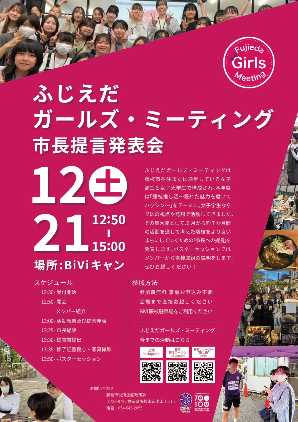 2023年12月21日(土)、静岡県藤枝市のBiViキャンで第9期「ふじえだガールズ・ミーティング」の活動発表会が行われました。この取り組みは、市内に住む女子高校生や専門学校生、大学生たちが集まり、自らのアイデアを活かして藤枝市の魅力を発信することを目的としています。今回の活動テーマは「藤枝推し活~隠された魅力を磨いてハッシン~」であり、メンバーは興味や関心ごとに分かれた5つのグループに協力して、藤枝市の新たな視点からの情報発信に努めてきました。