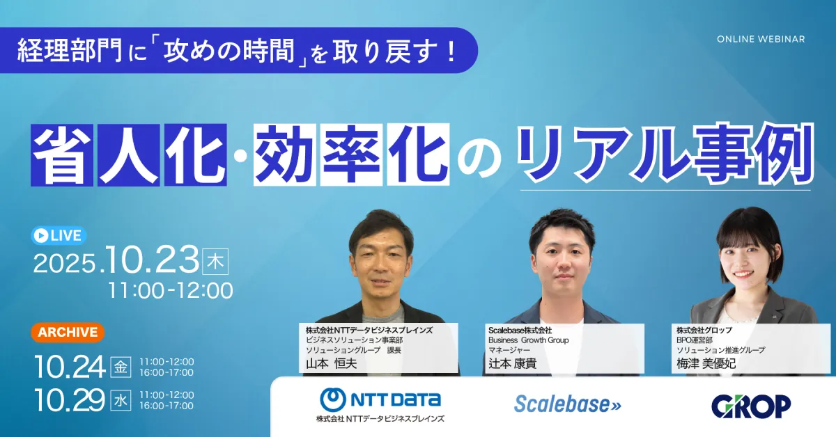 経理部門の担当者には、忙しい日常の中で新しい取り組みを考える余裕がないことも多いのではないでしょうか。そんな悩みを解消すべく、10月23日に「経理部門に“攻めの時間”を取り戻す!省人化・効率化のリアル事例」というウェビナーが開催されます。本イベントでは、具体的な事例を基に業務の省人化や効率化を実現するための方法論が紹介されます。