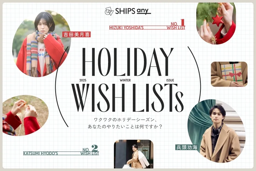 2025年のホリデーシーズンに向けて、株式会社シップスが展開する「SHIPS any」から新たなWEBコンテンツが登場します。その名も『HOLIDAY WISH LISTs-2025 WINTER ISSUE-』。公開日は12月4日。この特集では、俳優の兵頭功海さんと吉田美月喜さんが出演し、彼らがホリデーシーズンに叶えたい〝ウィッシュリスト〟を語ります。