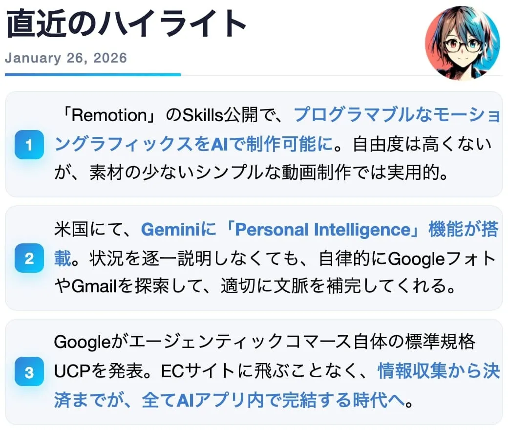 株式会社Mavericksが発信する「Mavericks AI ニュース」の1月26日号が配信されました。今号では、購読者数が8.5万人を突破したことを受け、最新のAI技術に関する貴重な知見が凝縮されています。現代のAIプロダクト開発の最前線で何が起こっているのか、その核心に迫る内容です。