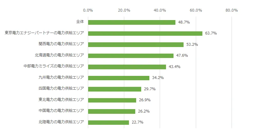 調査の結果、都市圏を中心に新電力への契約者の割合が増加していることが分かりました。特に、2016年の電力自由化以降に契約を開始した人々の間で、新電力を選ぶ割合が全体で48.7%に達しました。エリア別で見ると、東京電力エナジーパートナーが63.7%と最も高く、次いで関西電力が53.2%、北海道電力が47.6%と続いています。これにより、大都市圏が新電力契約のホットスポットであることが明らかになりました。