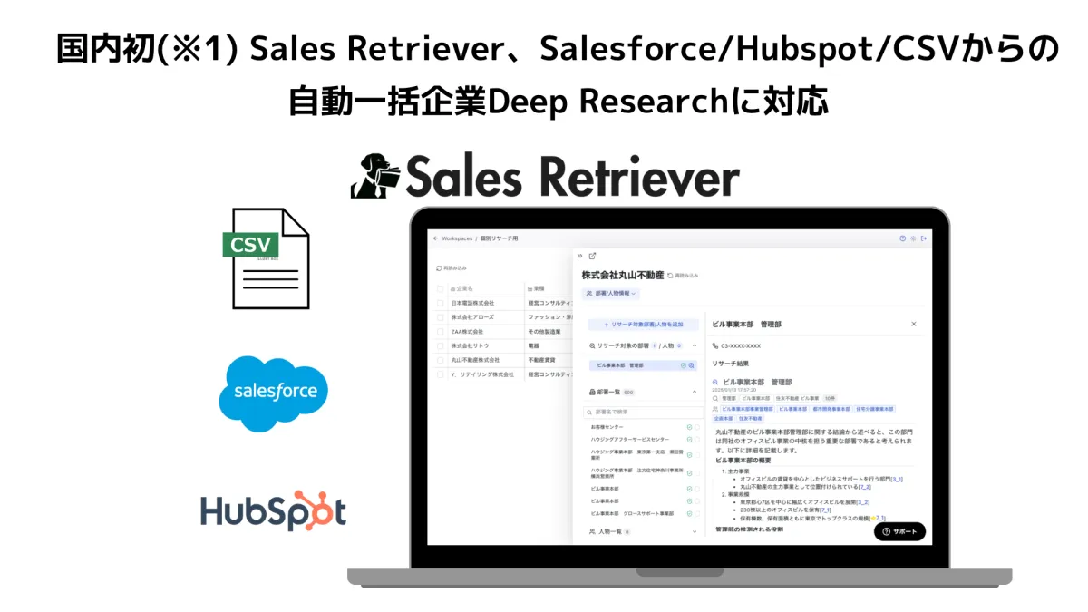 AIテクノロジーの急成長に伴い、様々な業界で改革が進む中、Sales Retriever株式会社はその最前線を走っています。東京都千代田区に本社を置く同社は、営業支援を目的とした企業リサーチツール「Sales Retriever」を展開しています。これまでのリサーチ性能に加え、新たにSalesforceやHubSpot、CSVファイルと連携した「自動一括企業Deep Research」機能を国内で初めて提供することを発表しました。