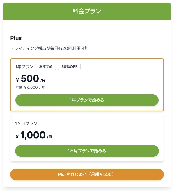 有料プランの「Plus」を選択することで、学習者はライティング添削機能を大幅に拡張することができます。具体的には、意見論述や要約、Eメール形式のライティング添削について、1日あたりの利用上限が無料プランの厳しい制限から開放されます。